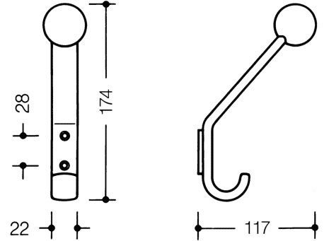 Hewi hat and coat hook with ball top 174 mm high, 22 mm wide and 117 mm deep centre to centre fixing points 28 mm made of high-quality polyamide supplied without fixing materials. Hewi colour Steel Blue (Colour 50)