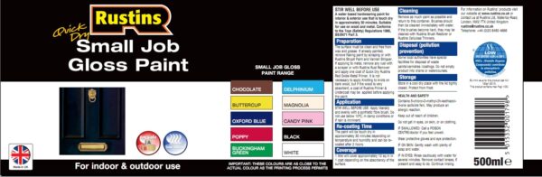 Rustins Small Job Gloss Paints are specifically produced for small painting projects. A 250ml tin covers approximately 3.25 sq metres, whilst a 500ml tin will cover 6-7 sq metres. Small Job Gloss Paint is available in 9 vibrant colours, plus Black and White in 250ml & 500ml sizes. It also conforms to the Toys (Safety) Regulations 1995, BS:EN71 Part 3, which makes it ideal to use on childrens toys.