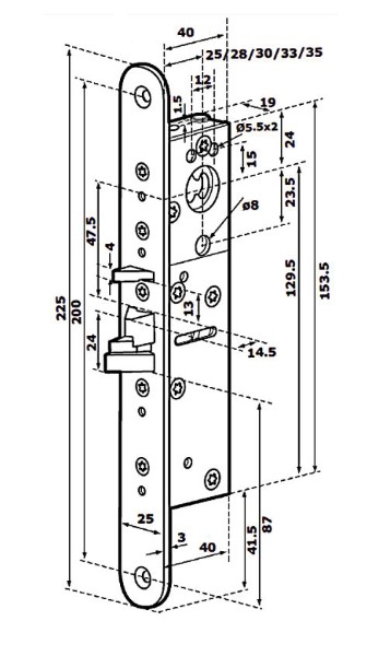 Double action bolt (deadlocks when door closes and collapses into lockcase as door is opened (push or pull)