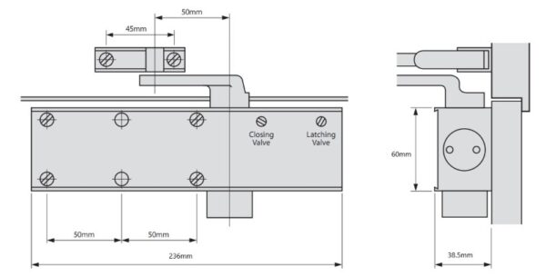 Designed to provide a controlled closing of single action doors. Extruded anodised aluminium body. Steel rack and pinion mechanism. Dual closing speeds, variable spring strength and stockholding. Optional features include adjustable delayed-action back-check facility and hold open arms. Reversible.
