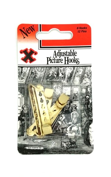 Adjustable Picture Hooks/Pins for Picture hanging. Steel material with a brass plated finish. Pack of 6.