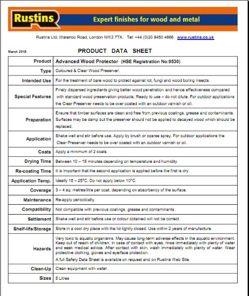Advanced Wood Preserver is a low odour, non-flammable product based on micro emulsion nanotechnology. The ultra-fine particle size allows deep penetration of the preserver to take place so the performance of the product is much greater than standard wood preservation products. It is quick drying and can be applied to wet or dry timbers. For use against wood rotting fungi within domestic, commercial, institutional and industrial premises.