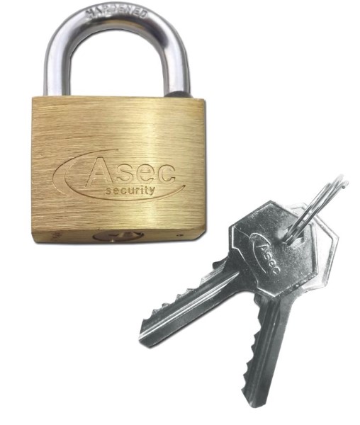 This brass padlock from Asec is 45mm wide. It is keyed to differ and has a double locking open shackle with a hardened steel construction.