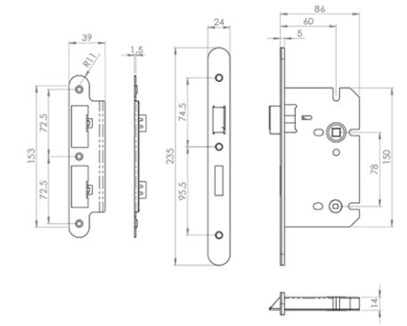 DIN Standard Mortice Bathroom Lock With 60mm Backset And 78mm Centres, T/Turnfollower is 5mm. En12209. Fd30/60. Finish: Satin Stainless Steel. Category Of Use Grade 3.