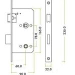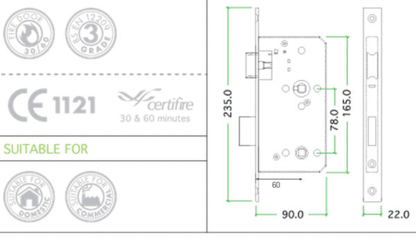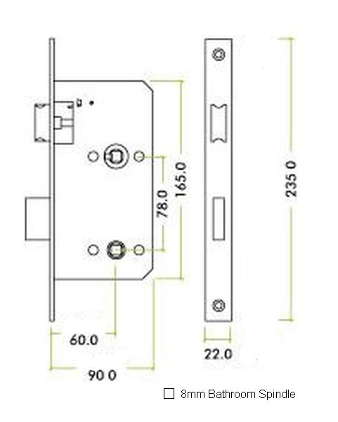 DIN Standard Mortice Bathroom Lock. 60mm Backset &78mm Centres T/Turn Follower 8mm. 22mm SS304 Stainless steel forend. Grip tight 8mm follower. SS304 Stainless steel latchbolts and deadbolts. Fire tested for use with 30 & 60 minute timber doors. BS EN 12209:Grade 3. Suitable for domestic or commercial applications.
