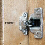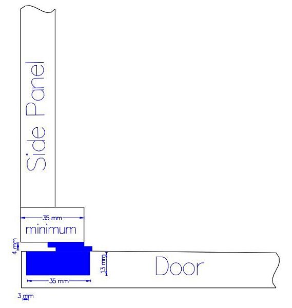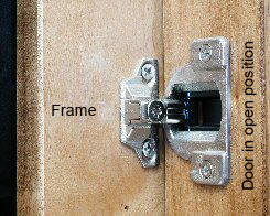 The Blum 33 sprung hinge is used on face frame type cabinets and mounts in a 35mm hole in the back of the cabinet door. The hole depth is 1/2in. The bore distance (distance from the edge of the 35mm hole to the edge of the door) is 1/8in for all applications of this hinge. Door opening angle is 110 degrees.