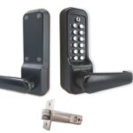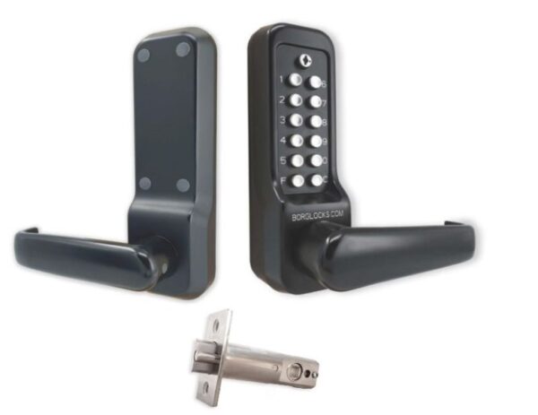 Borg heavy duty marine quality mechanical digital lock. Lever handle operation with clutch. Easi-code pro code change by special key (no need to remove from the door). With 60mm backset (84mm deep) anti-thrust tubular mortice latch – can also use a DIN standard 8mm spindle nightlatch or sashlock (with a Scandinavian Modular version. Use recommended intumescent on mortice latches for fire doors. Passage mode function. Over 1000 combinations (not sequential). Stainless steel coding mech. Reversible. Marine grade black.
