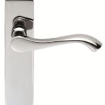 Andros Lever on latch backplate. A solid curved sweeping lever on an elegant rounded backplate with a chamfered section at the top and bottom. The smooth and solid feel oozes quality making this a deluxe handle of choice. The other feature is the single hole top and bottom, which accepts the back-to-back bolt through fixings giving a discreet and neat finish. Comes with a 10 year mechanical guarantee and is Fire door rated.