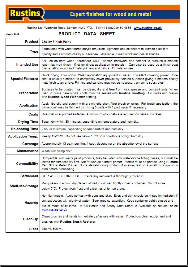 Rustins Quick Dry Chalky Finish Paint is designed to revive and give your furniture a new lease of life. Suitable for use on interior work, it contains wax and dries to a velvety flat matt finish. Very little preparation is required to receive the desired look as it can be painted over most previously coated items. If using over previously coated surface, test a small area for compatibility. Get the shabby chic look by painting your furniture with multiple coats then distressing it by lightly sanding down small areas using fine sandpaper or Rustins 0000 Steel Wool.