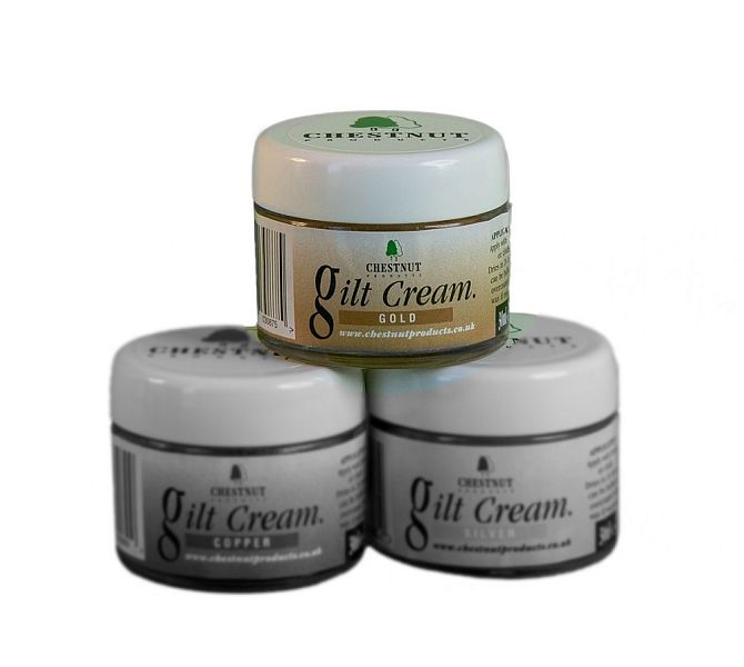 Gilt Creams are a creamy, waxy paste with metallic flakes and pigments in them, giving a rich, lustrous finish to whatever they are applied to.