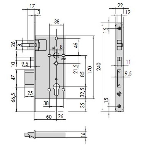 CISA Euro Mortice Auto Deadbolt Lock. handle (use 1 side) retracts 17mm auto deadlocking easy close latch & 25mm auto locking deadbolt , OK unsprung furn. 85mm Centres. 60mm backset. Square stainless Steel Forend.
