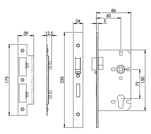 Din Standard Mortice Escape Lock With 60mm Backset And 72mm Centres. En12209. Fd30/60. Finish: Satin Stainless Steel. Category Of Use Grade 3. Complete with Split Spindle. Requires pair Levers and Euro Cylinder (Double or Key & Turn).