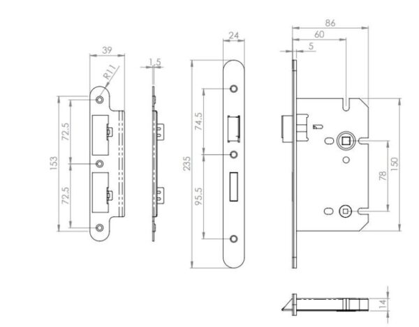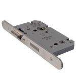DIN Standard Mortice Bathroom Lock With 60mm Backset & 78mm Centres, T/Turn Follower 5mm. 10yr Mechanical Guarantee. Conforms to BS EN 12209. Certifire Approved. Suitable for FD30/60 rated fire doors. Finish: Satin Stainless Steel. Category Of Use Grade 3. Please note, this lock has Radiused forend and faceplate