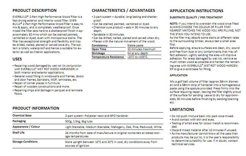 Multi-Purpose Wood Filler fills nail holes, cracks, gaps and minor imperfections in wood. It is easy to sand and can be stained, varnished and painted and is solvent free.