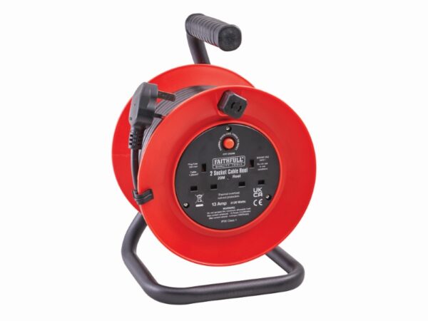 The Open Drum 20M Cable Reel, made by Faithfull, is very handy coming with twin 230V sockets and at a great price. The 1.25mm², cable is fitted with a standard 240V plug. For added safety, the reel is fitted with a thermal overload protection system to prevent overheating damaging the cable when in use.