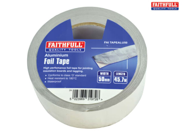 Faithfull Aluminium Foil Tape is soft, conformable and has been approved to class ‘O’ rating. Used widely in the insulation marketplace on foil-faced pipe and slab sections. It is heat-resistant to 180degC and protects wires and pipes against the effects of fire, dust and moisture.