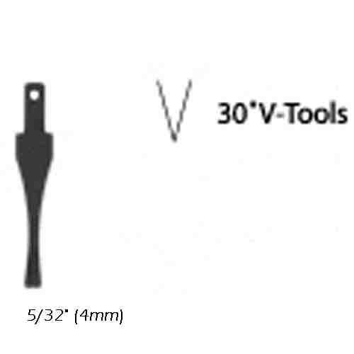 The Flexcut SK chisels will fit into the Flexcut handle (810478) for carving by hand or, by using the 810480 adaptor, into the Bosch Power Carver. 30deg x 5/32in (4mm)