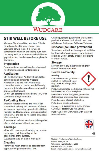 Wudcare Floorboard Gap and Joint Filler is based on a flexible water-borne, non-yellowing acrylic resin. For use in combination with saw or sanding dust from carpentry work as a colour-matched filler for gaps between flooring boards and joints.