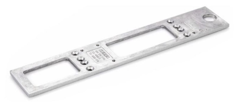 Mounting plate to suit TS4000E & TS5000EFS electro-magnetic series of door closers. Allows secure fixing to poor materials when the door top rail has a projected rebate overlapping the transom, often on aluminium or UPVC doors. Certifire listed for use on 120 minute fire doors as required in Europe. Silver Finish.
