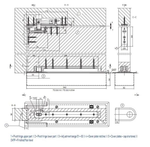 SSS cover plate, double action top centre pivot and double action bottom strap for use with TS550 series floor springs. Certifire listed for use on 120 minute fire doors.