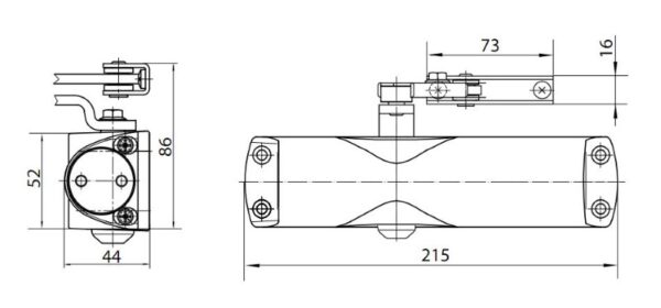 Overhead rack and pinion door closer for light internal doors. Suitable for standard and transom mounting, and for DIN left and DIN right doors up to 950mm wide. A mounting plate is available for doors where direct mounting is not possible. Certifire Certificate of approval CF144.