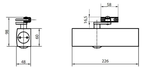 Fig 1/61/66. Variable closing force, size 2/4/5 to EN 1154. Closing speed adjustable at front. Latching action adjusted via link arm. Attractive link arm. Hold-open arm can be used (max 150¬). Concealed mounting plate. Can be used for right and left hand doors without adjustment.