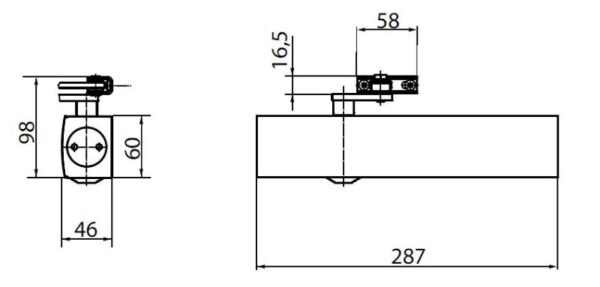 Overhead rack & pinion delayed action door closer. Adjustable closing force (size 1-6). Fig 1/61/66. Closer in only one construction size. Optical size indicator (EP-patent). Backcheck and thermo-constant closing speed adjustable at front. Latching action adjusted via link arm. Safety valve in open and close direction. Includes PA bracket.