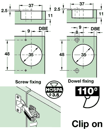 Grass standard 110deg hinge, Diam: 35 mm cup, screw fixing, click on arms, sprung