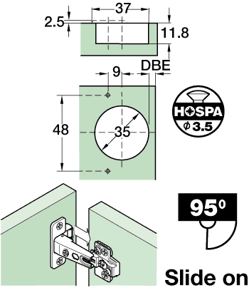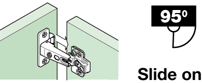Grass standard 95deg hinge, Diam: 35 mm cup, screw fixing, slide on arms, sprung