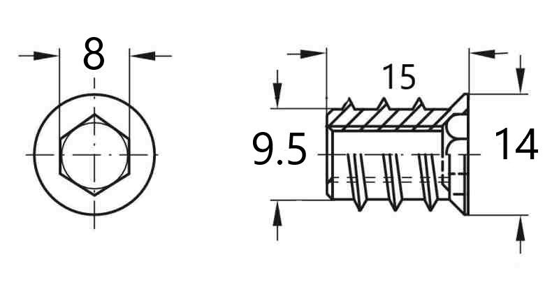 Screw-in sleeve, M8 internal thread, hexagonal socket head, zinc-plated steel. Internal thread: M8, Socket size: SW8, Length: 15 mm
