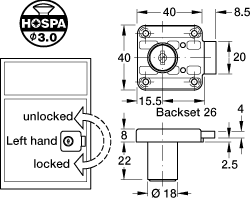 Rim Lock, with Ø 18 mm Cylinder, Left Hand Version.