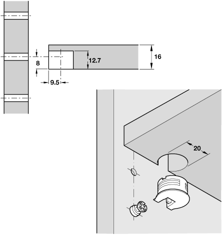 The housing is pressed into the shelf and pushed onto a Rafix Diam: 7 mm connecting bolt, available seperately