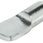 Shelf Support, plug in, for wooden shelves and 7mm diam holes, or 7.5 mm drill hole (with sleeve). Spoon shaped. Nickel plated.