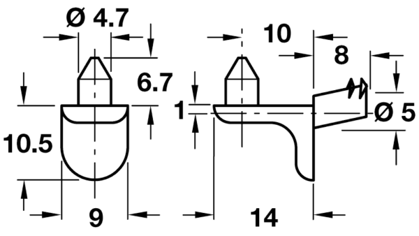Shelf support, plug in for Diam: 5 mm hole, 150 kg load carrying capacity