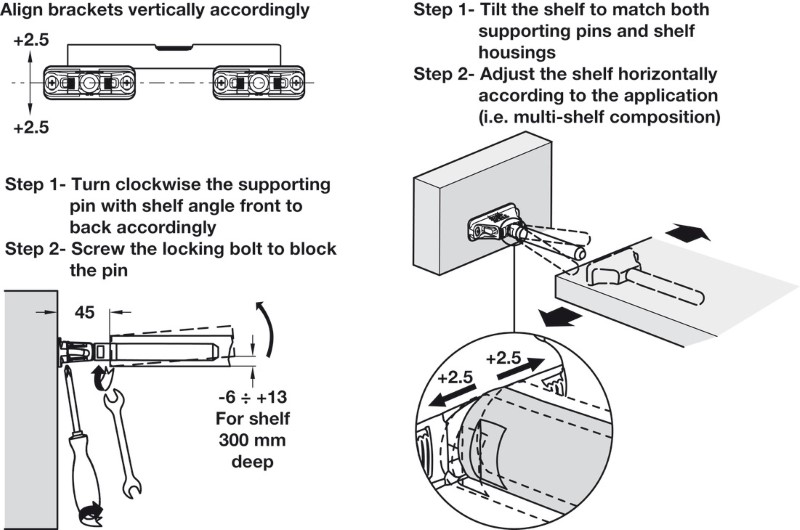 Load carrying capacity: 15 kg per support (shelf weight included) for max. shelf depth 300 mm