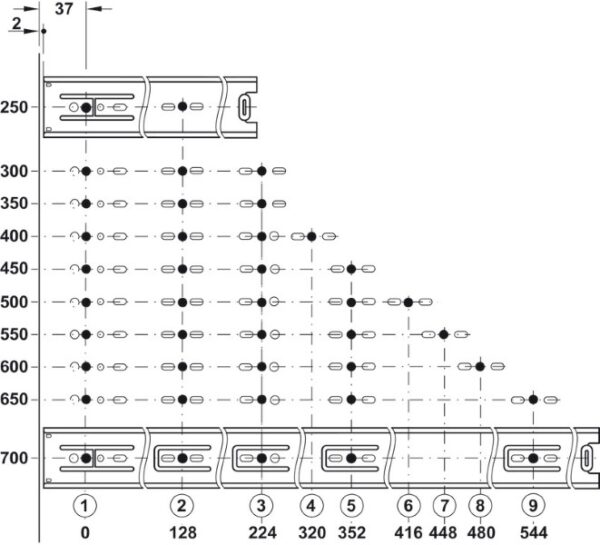 With front disconnect lever, Installed length 450 mm, extension length 450 mm, load capacity 45 kg. Zinc plated.