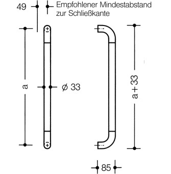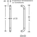 Load bearing capacity under alternating load 100 kg on wooden and metal doors, 50 kg on PVC doors, with 2 fixing points, fixing outside the lock area or within the lock area, as well as fixing through the lock. Straight handle in a curved shape, with straight supports, for mounting on leaf doors, in conjunction with BA5.0 for frame doors, fulfils the handle requirements of the guidelines of the German Federal Association of Accident Insurance Funds (Bundesverband der Unfallkassen e. V. – BUK) – safe distance from the closing edge 25 mm.