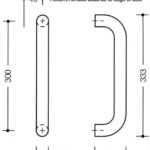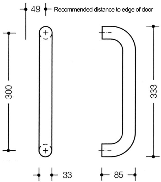 Load bearing capacity under alternating load 100 kg on wooden and metal doors, 50 kg on PVC doors, with 2 fixing points, fixing outside the lock area or within the lock area, as well as fixing through the lock. Straight handle in a curved shape, with straight supports, for mounting on leaf doors, in conjunction with BA5.0 for frame doors, fulfils the handle requirements of the guidelines of the German Federal Association of Accident Insurance Funds (Bundesverband der Unfallkassen e. V. – BUK) – safe distance from the closing edge 25 mm.