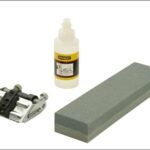 Convenient three piece set consisting of sharpening stone, bottle of lubricating oil and a honing guide.