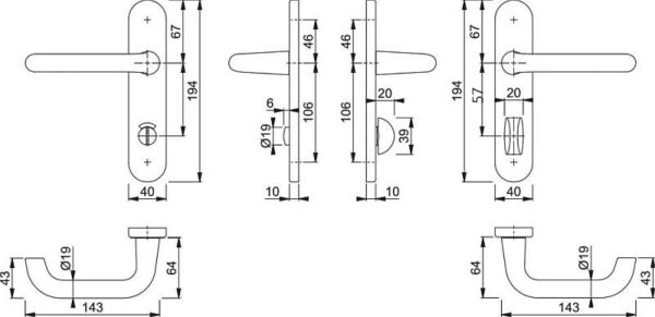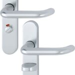Aluminium handle set on short backplate with emergency release/turn and red-white-indicator for bathroom/WC doors