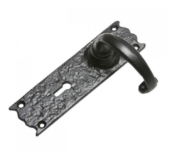 Black antique malleable iron lever handle with bathroom/privacy fitting. Spring loaded. Two coat protective finish. Bathroom, latch and lock options available (lock version shown). Also available in cast brass, pewter and argent.