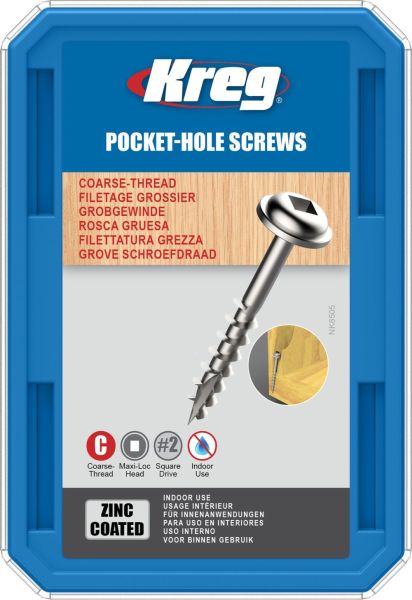 Kreg Screws are specifically designed to hold your pieces together to create a strong, long-lasting joint. Zinc screws are recommended for a wide variety of indoor projects where moisture is not a concern. Coarse-Thread screws are recommended for use with softwoods like cedar, pine, fir, etc. as well as for sheet goods such as plywood and MDF that are soft and not very dense. Coarse screws have deep, aggressive threads that bite into those soft fibers to ensure solid holding power.