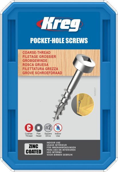 Kreg Screws are specifically designed to hold your pieces together to create a strong, long-lasting joint. Zinc screws are recommended for a wide variety of indoor projects where moisture is not a concern. Coarse-Thread screws are recommended for use with softwoods like cedar, pine, fir, etc. as well as for sheet goods such as plywood and MDF that are soft and not very dense. Coarse screws have deep, aggressive threads that bite into those soft fibers to ensure solid holding power.