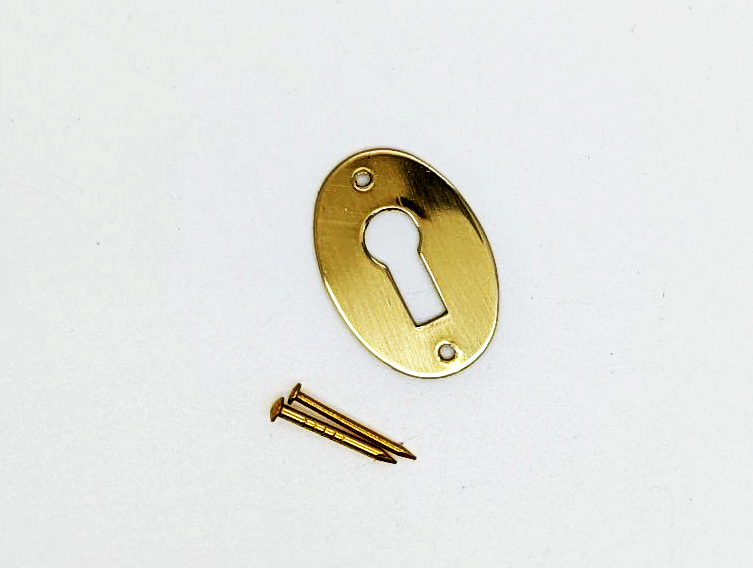 Cabinet escutcheon, key hole. 28 x 19mm. Polished brass. Complete with brass pins.