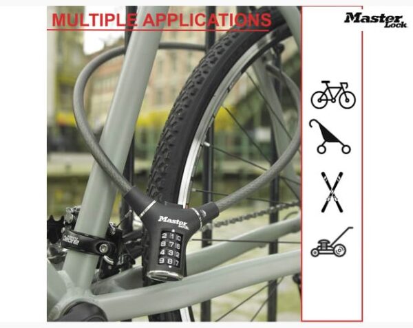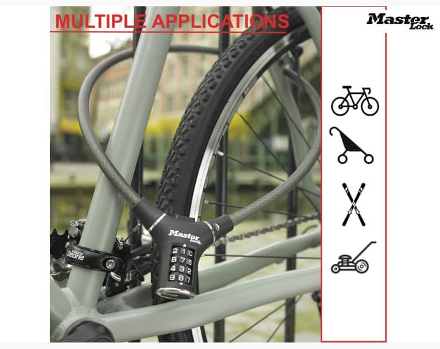 Master Lock 8229 Black Steel Rigid Combination Cable with ergonomic combination design. This lock is especially designed to be used in cities, the lock body of this cable is ergonomic. The combination can be easily changed and reset as needed.