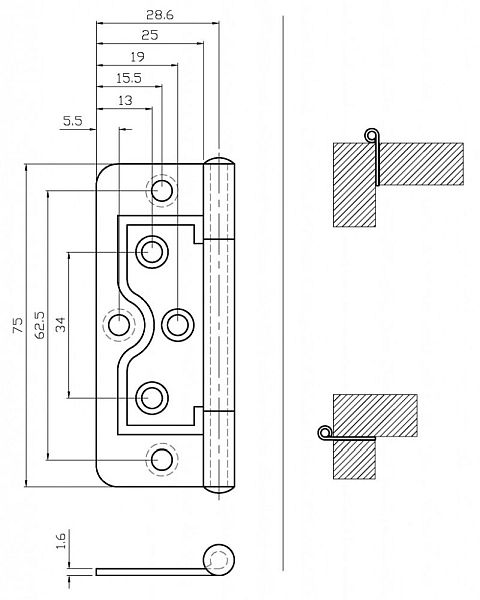 Standard Pattern Flush Furniture Hinge. 6 hole. 75mm.