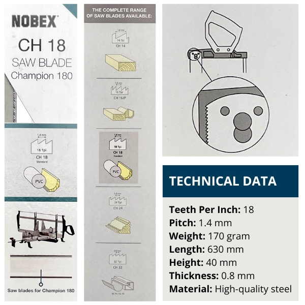 Nobex Blade for 180 Champion mitre saw, long-life replacement blades are made of high-quality steel. With hard point teeth for maximum life and ideal for fast wood cutting. Please note: This blade will not fit the Proman type saw.