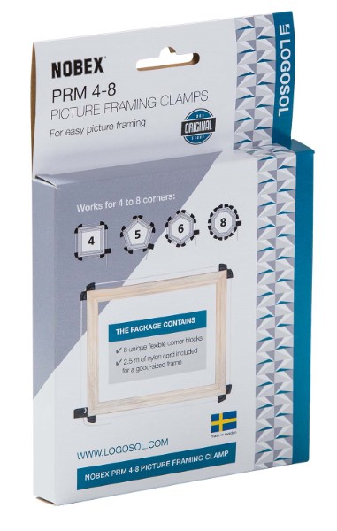 Nobex Frame Clamp. Can be used for picture framing. Each corner that the cord passes through is tough, yet flexible plastic. The larger corner has a cleat to lock it absoloutely tight and is quick and easy to use. Includes: 2.5m of nylon cord for a good size frame and 4 or 8 unique flexible corners.