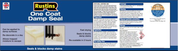 Rustins Damp Seal is a fast drying high performance interior paint which permanently covers damp, water stains and most household stains. It dries with a long lasting permanent seal over damp walls and ceilings and can be over coated with gloss or emulsion paint as well as wallpaper. It does not cure the damp but is specially formulated to allow trapped moisture to escape over time so preventing flaking of the paint or peeling of wallpaper.