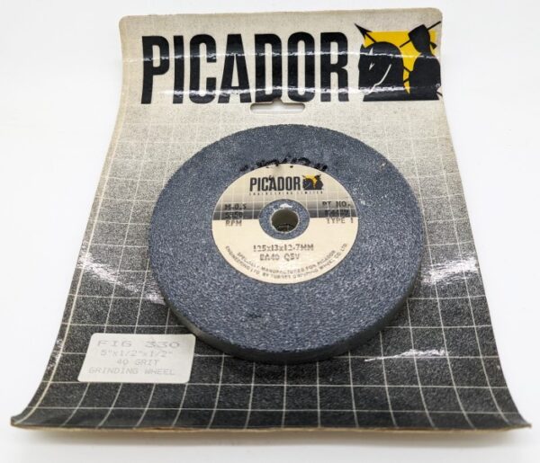 Aluminium oxide grinding wheel. 5in x 1/2in x 1/2in. 125x13x12.7mm. 40 Grit. Maximum speed 5350 RPM.
